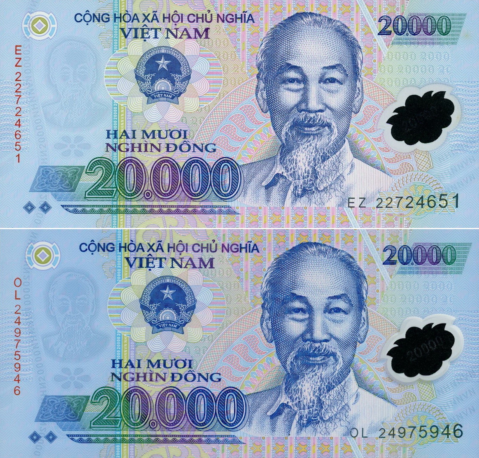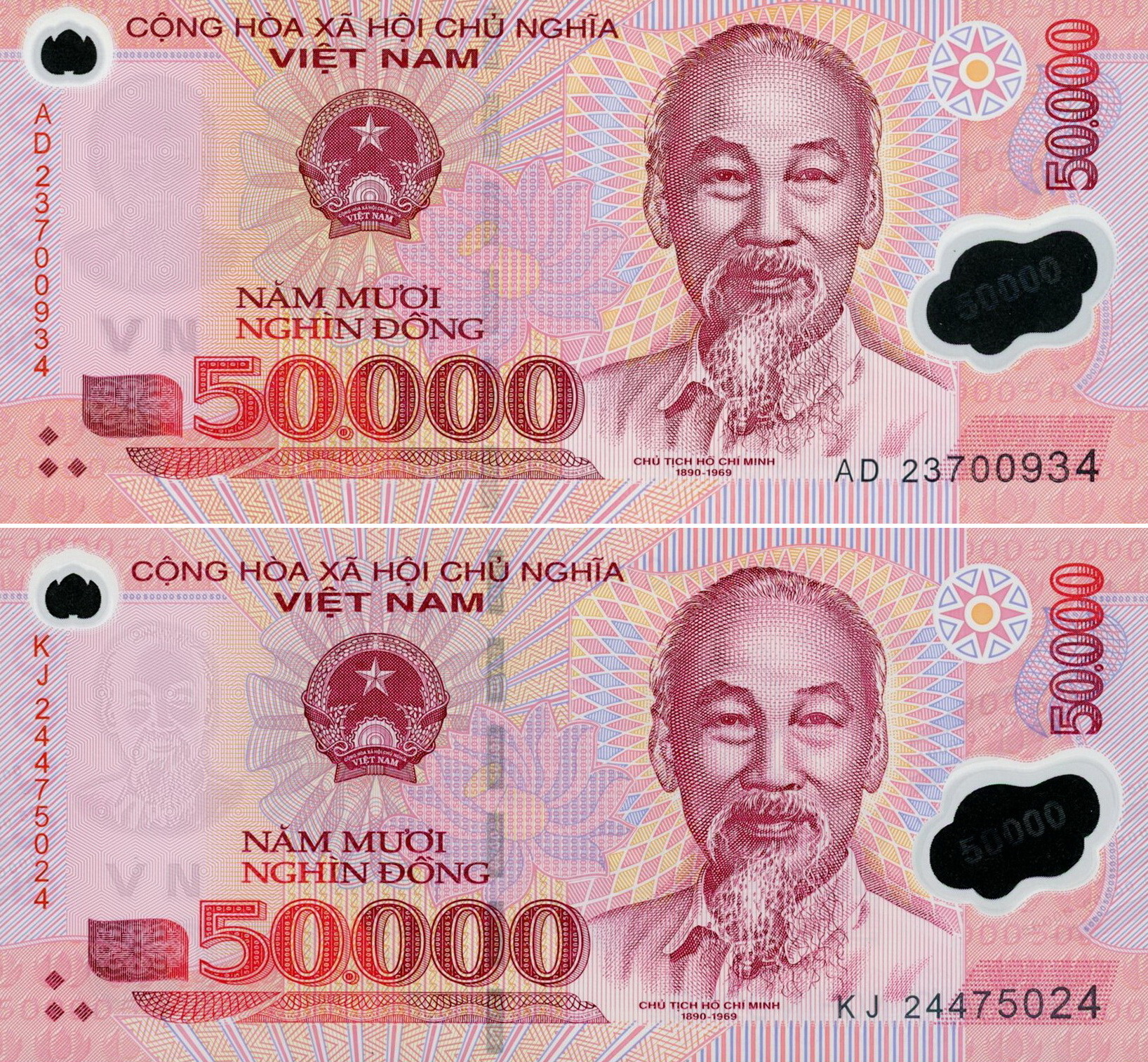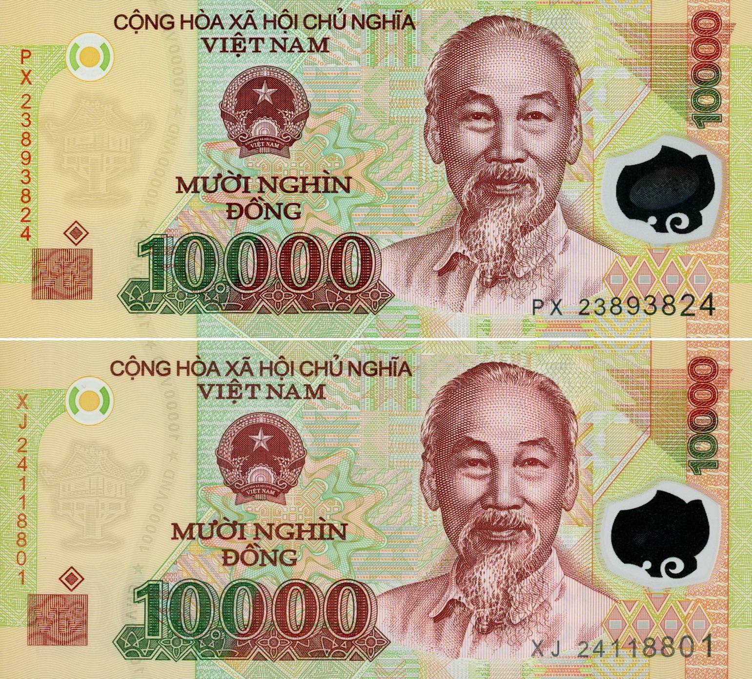 Việt Nam began issuing its higher-denomination, circulating banknotes on polymer beginning with 50,000-dong and 500,000-dong banknotes in 2003. The other denominations (10K, 20K, 100K and 200K) followed in subsequent years. Up to and including 2023, the polymer substrate used for all denominations was Guardian™, produced by CCL Secure. The banknotes were first printed by Note Printing Australia (NPA), followed by the domestic National Banknote Printing Plant (NBPP), now the sole institution authorized to print Vietnamese currency. (Note: The first two digits of the serial number denote the year of printing.)