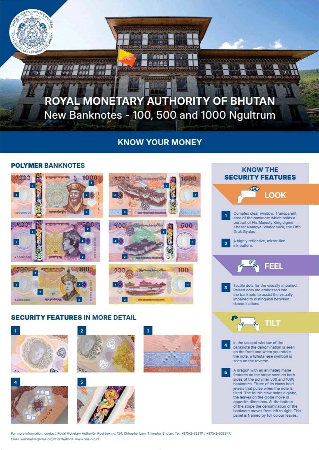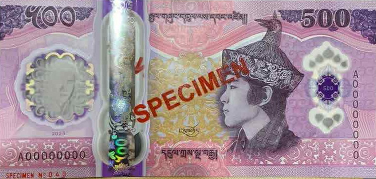 - A small, second window. The note's denomination is seen from the front and a Bhutanese symbol is seen from the back.