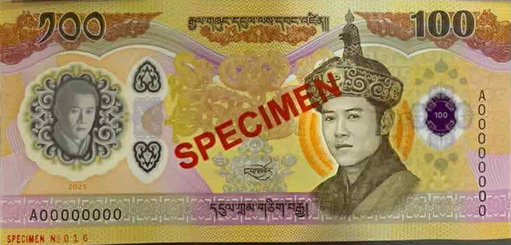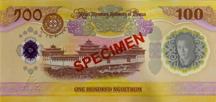 - The 100-ngultrum banknote celebrates the reign of the Fifth Druk Gyalpo, Jigme Khesar Namgyel Wangchuck (born 1980), the current King of Bhutan since 2006. He is pictured on the front. The reverse shows Tashichho Dzong, a Buddhist monastery and fortress on the northern edge of the city of Thimphu, on the western bank of the Wang Chu. It has traditionally been the seat of the Druk Desi, the head of Bhutan's civil government.