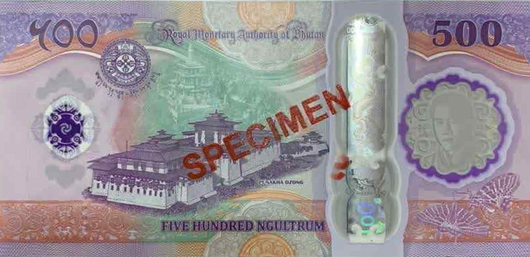 - The 500-ngultrum banknote pays tribute to the Fourth Druk Gyalpo, Jigme Singye Wangchuck (born 1955), who reigned from 1972 to 2006 and is the father of the current King. The reverse shows Punakha Dzong (the palace of great happiness), the administrative center of Punakha District in Punakha. Punakha Dzong was the administrative center and the seat of the Government of Bhutan until 1955 when the capital was moved to Thimphu.