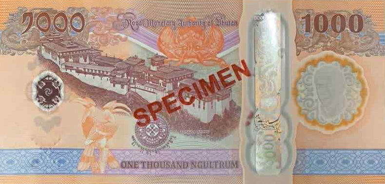 - The 1000-ngultrum banknote honors the First King, Gongsar Ugyen Wangchuck (1862-1926), the founder and first king of Bhutan, who reigned from 1907 until his death. The reverse shows Trongsa Dzong, the largest fortified fortress-monastery in Bhutan, located in Trongsa in the center of the country. Built on a spur overlooking the gorge of the Mangde River, a temple was first established at the location in 1543.