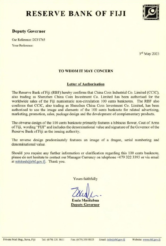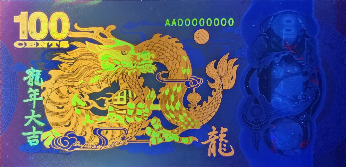 On August 8, 2023, the Reserve Bank of Fiji (RBF) will release a new, non-circulating, "legal-tender" commemorative "banknote" in the denomination of 100 cents to commemorate the upcoming Chinese Lunar Year of the Dragon.