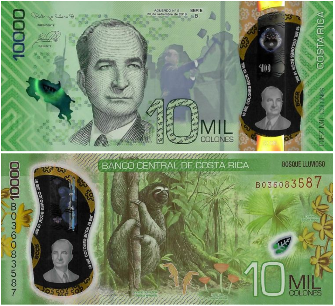 Costa Rica's 10,000-cólones banknote, issued on October 15, 2021, features José Figueres Ferrer on the front and a three-toed sloth on the reverse.