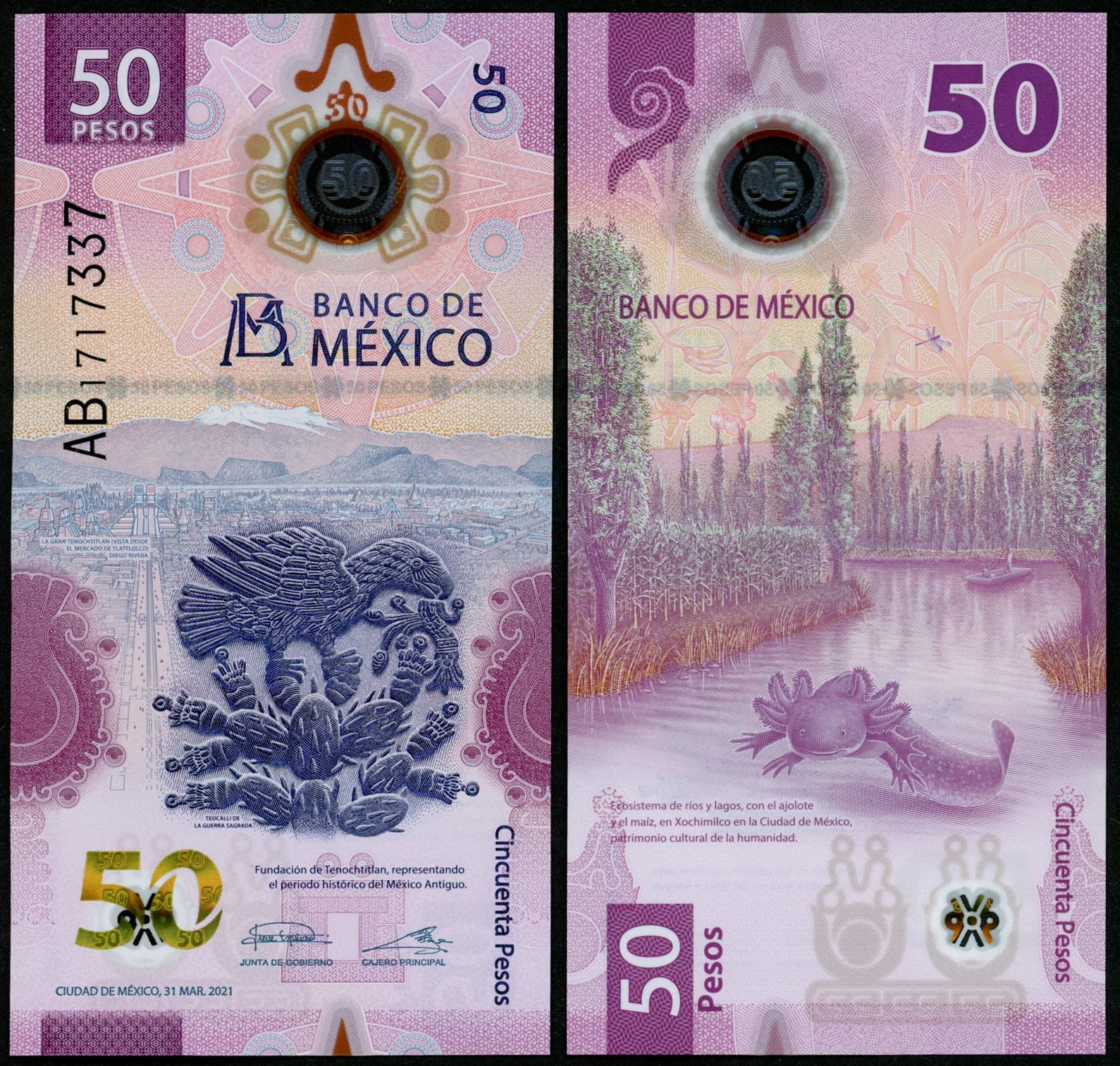Issued on October 28, 2021, Mexico's 50-peso banknote portrays thematic motifs that allude to the historical period of Ancient Mexico, showing the founding of Tenochtitlan and the ecosystem of rivers and lakes with their representative fauna and flora, specifically portraying Xochimilco, a site recognized in the "World Heritage" list of the United Nations Organization for the Education, Science and Culture (UNESCO). A Mexican axolotl (Ambystoma mexicanum, a salamander that reaches adulthood without undergoing metamorphosis) is prominently illustrated on the reverse. It is worth noting that Mexico also won in 2020 with its beautifully designed 100-peso polymer banknote.