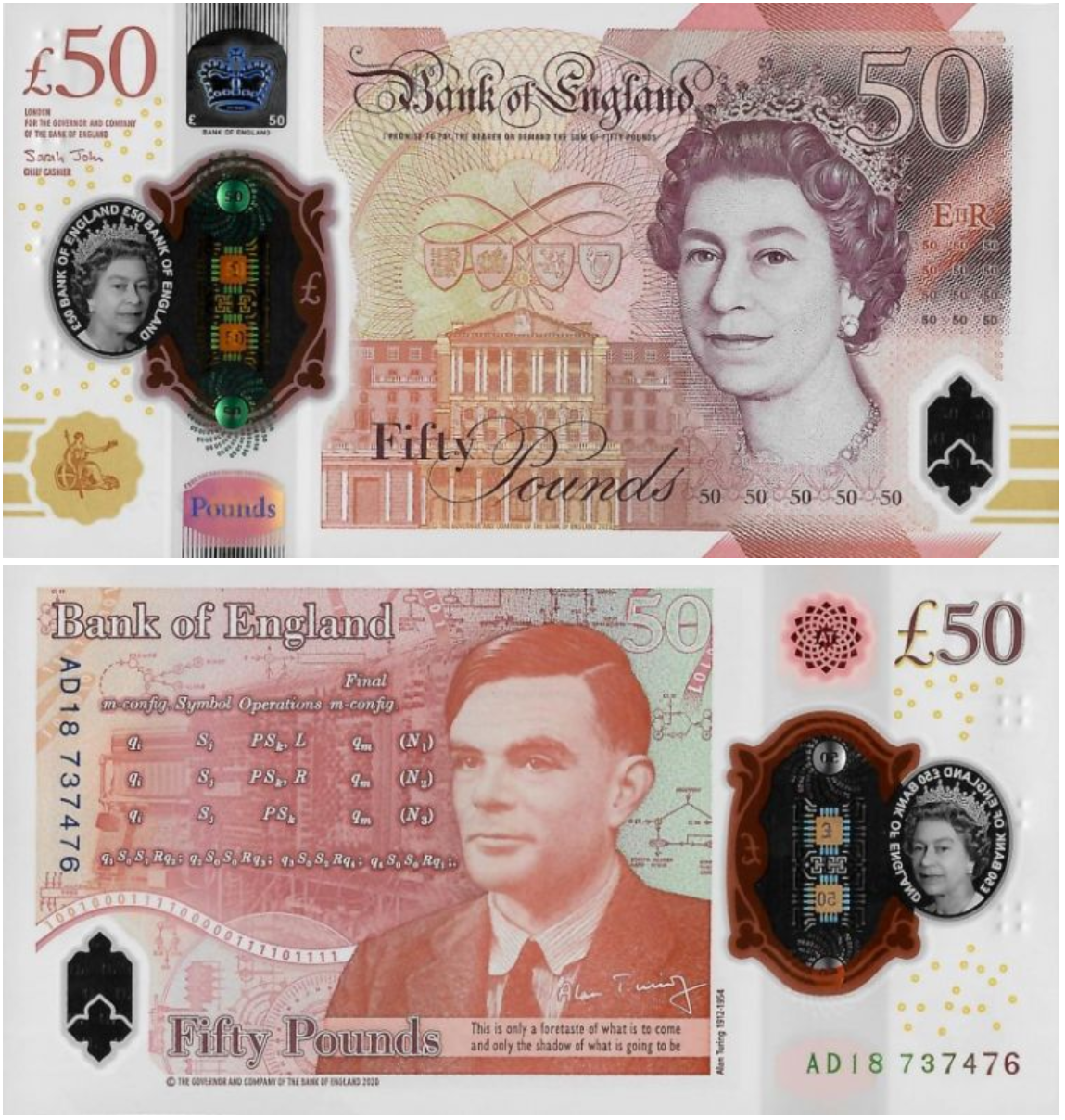 The Bank of England's 50-pound banknote, issued on June 23, 2021, features Queen Elizabeth II on the front and Alan Turing on the reverse.