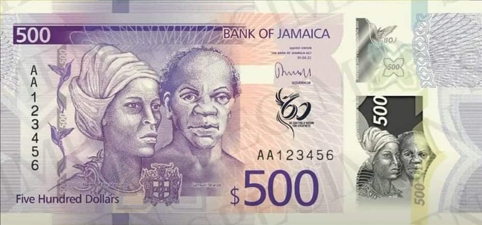 - $500: National heroes, Nanny of the Maroons (an 18th-century leader of the Jamaican Maroons, who led a community of formerly enslaved Africans) and Sam Sharpe (an enslaved Jamaican who was the leader of the widespread 1831–1832 Baptist War slave rebellion in Jamaica).