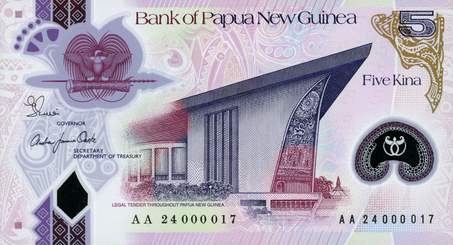 The first two digits of the serial number (24) represent the year of printing. The notes are the same as the reduced-size 5-kina note first issued in (20)16 and the 20-kina banknote first issued in (20)21, except for the year of printing and the signatures. The new notes are signed by Elizabeth Genia (Governor) and Andrew F. Oaeke (Secretary Department of Treasury).