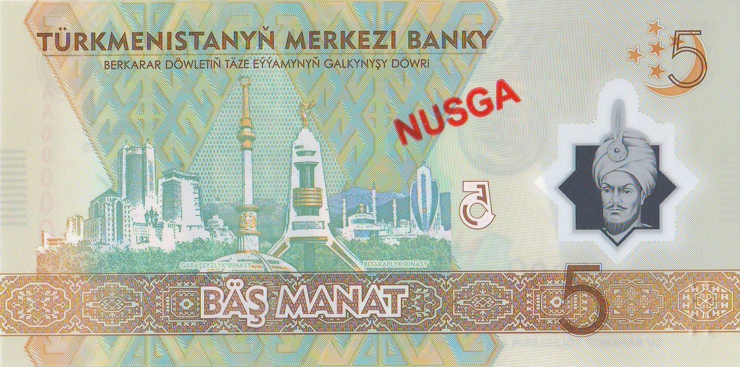 The 5-manat banknote features Soltan Sansar Türkmen (1086 - 1157) on the front and the Independence Monument and Neutrality Arch in Ashgabat on the reverse. Soltan Sansar Türkmen was a Seljuk prince of Khorāsān from c. 1096 to 1157, whose fame almost eclipses that of the Great Seljuks because of the length of his reign, his power and victories in its first half, his disasters in the second, and the fact that he was the last real Seljuk sultan in Iran.