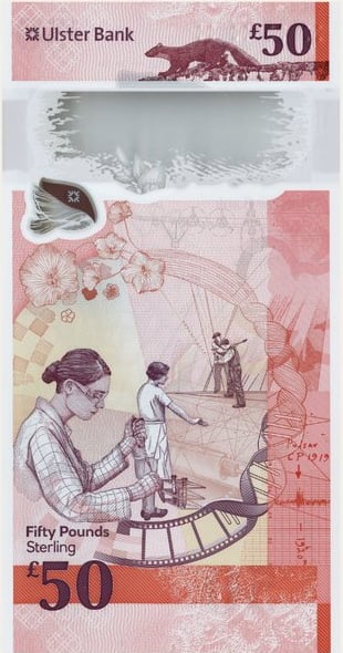 The reverse of the banknote also portrays a "Millie" (female mill worker) working at the loom, as an homage to the unsung heroes of Northern Ireland's great linen industry. These women were seen as "unskilled operatives" at the time but have since been celebrated for their skilled work. There are also nods to the shipbuilding and aviation sectors, the creative industries and Northern Ireland's place as a center of excellence in cyber security.