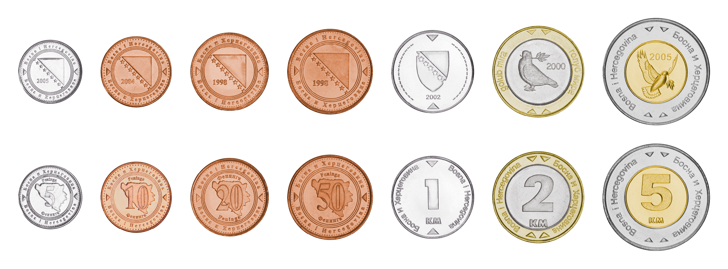 Bosnia and Herzegovina coin set, from 1998-2017, including denominations: 5, 10, 20, 50 Feninga, 1, 2, 5 Convertible Marka, KM 121, 115, 116, 117, 118, 119, 120