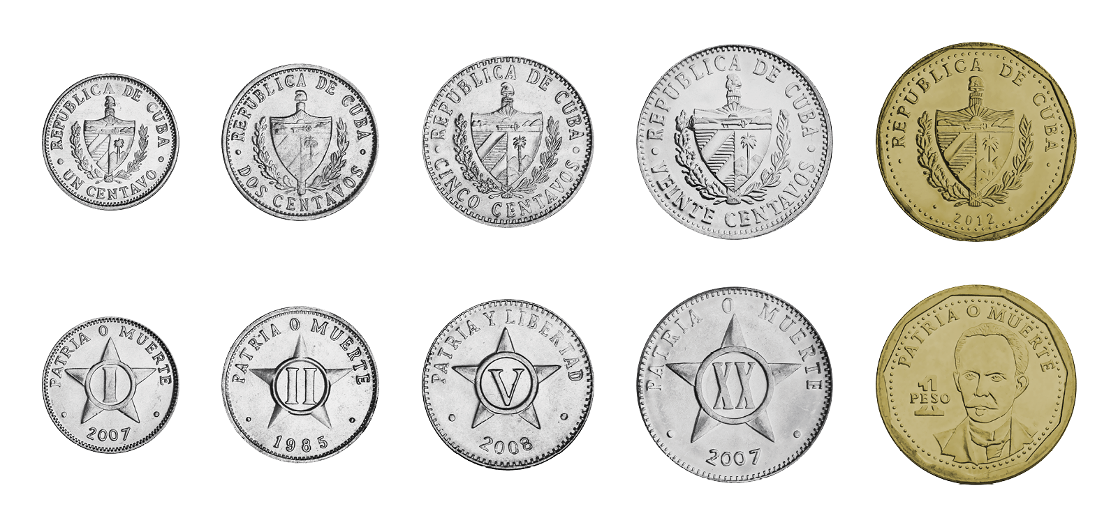 Cuba coin set, from 1963-2013, including denominations: 1, 2, 5, 20 Centavos, 1 Peso, KM 33, 104, 34, 35, 347