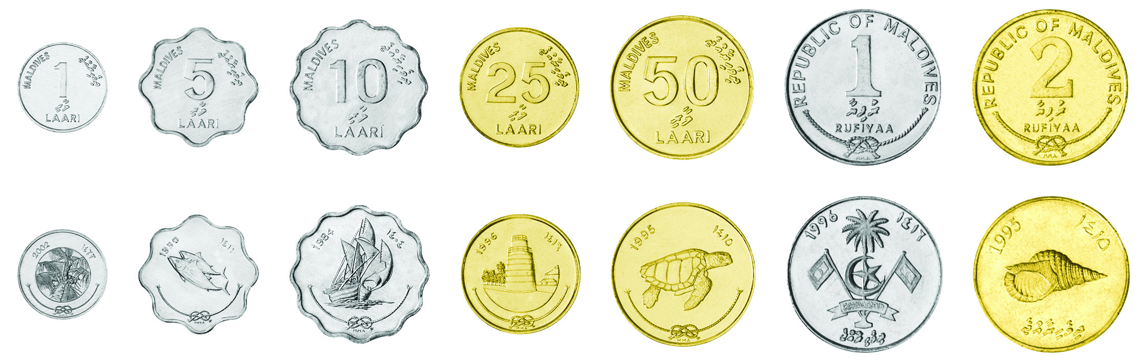 Maldives coin set, from 1984-2017, including denominations: 1, 5, 10, 25, 50 Laari, 1, 2 Rufiyaa, KM 68, 114, 115, 71, 72, 73, New