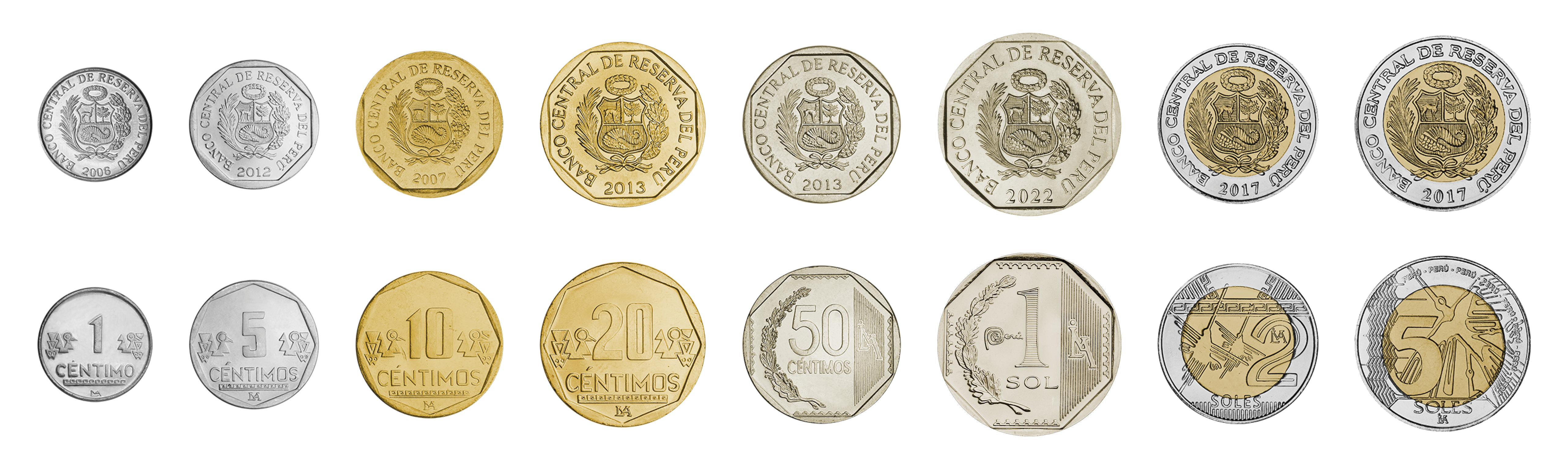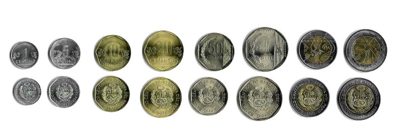 Peru coin set, from 2001-2025, including denominations: 1, 5, 10, 20, 50 Centimos, 1, 2, 5 Soles, KM 303, 304, 305, 306, 307, 395, 401, 402