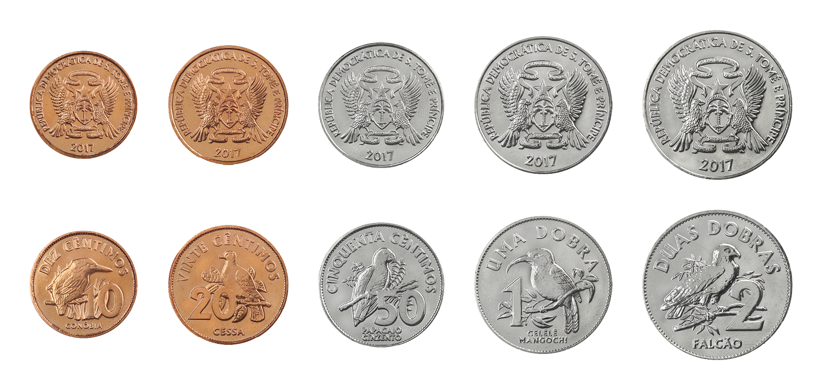 Sao Tome and Principe coin set, from 2017, including denominations: 10, 20, 50 Centimos, 1, 2 Dobras, KM New