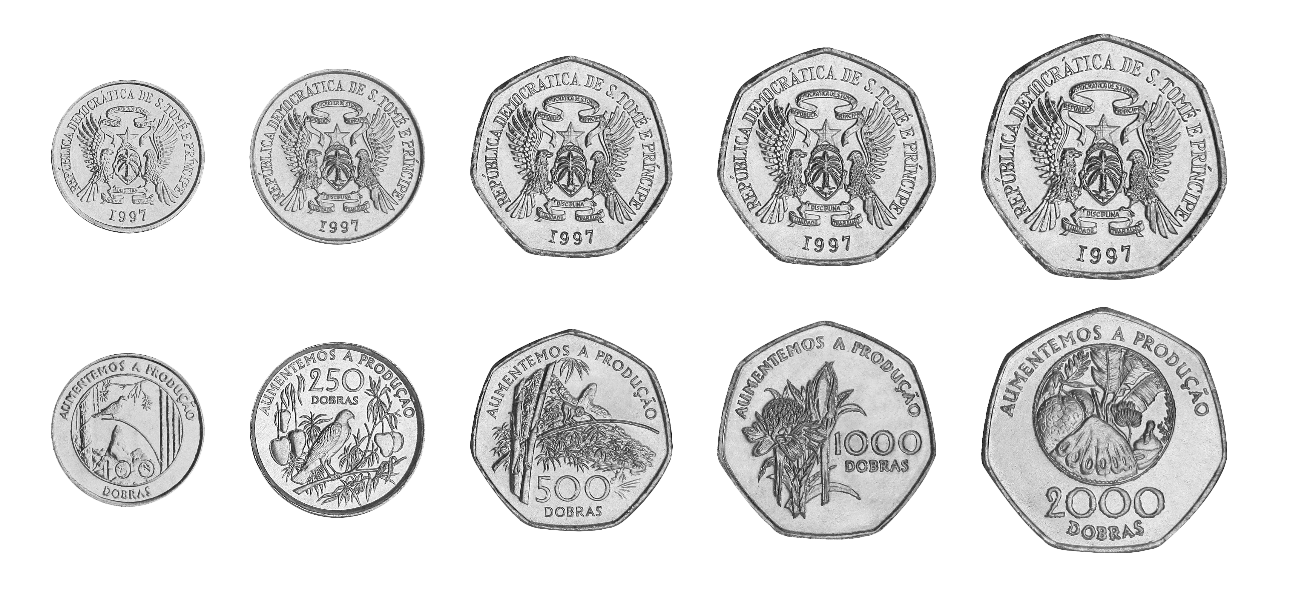 Sao Tome and Principe coin set, from 1997, including denominations: 100, 250, 500, 1.000, 2.000 Dobras, KM 87, 88, 89, 90, 91